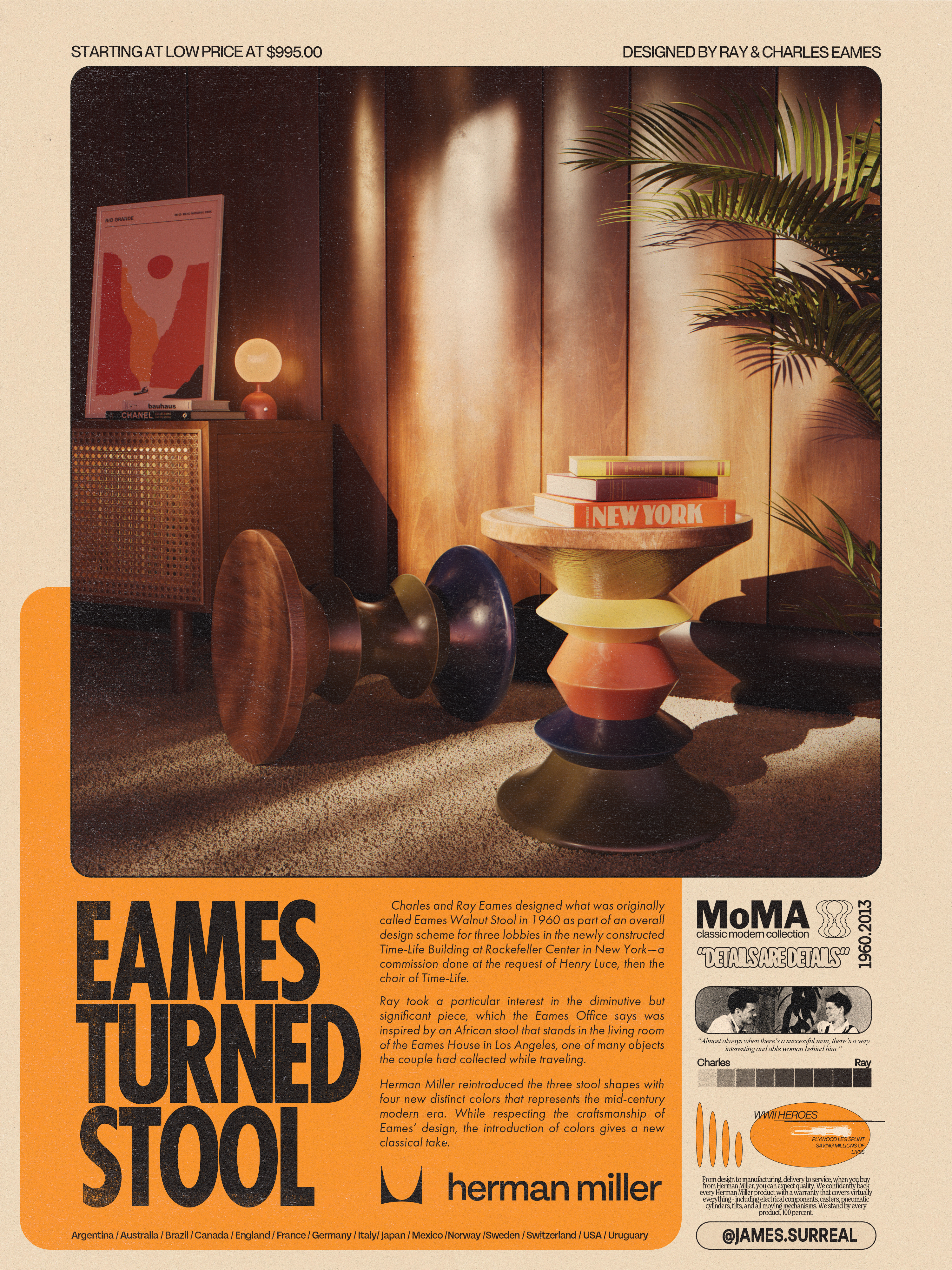 3D motion-infused furniture posters for "Eames Turned Stool" by Charles & Ray Eames. While respecting its original craftsmanship, I designed my own version of its collection, which comes in four new mid-century modern-inspired colors. TIt was inspired by vintage graphic ads from the 80s/ 90s. I put a lot of attention to detail within it’s colors and textures to give it that distinct nostalgic look.