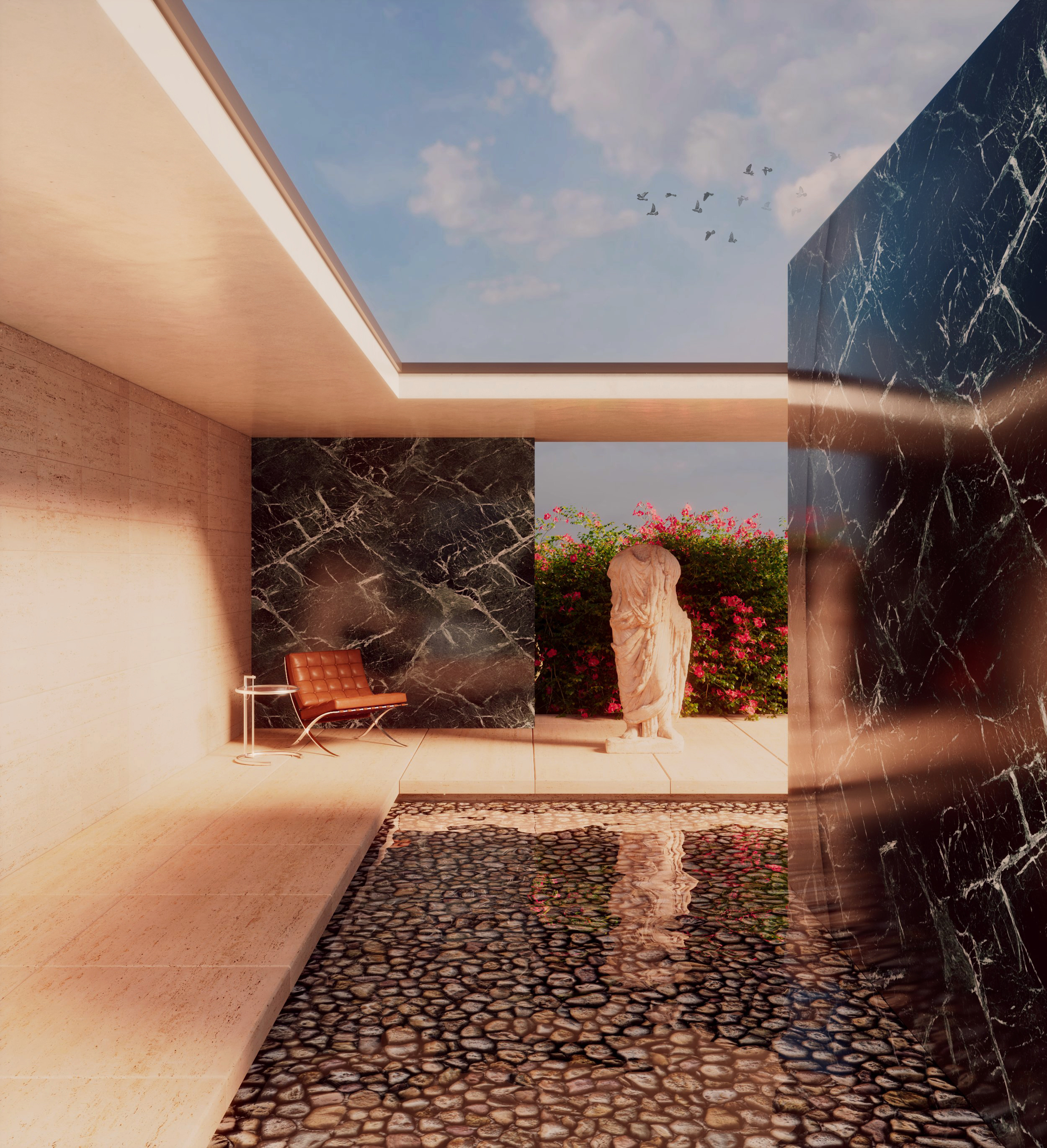 A tribute to the famous architectural movement, Mid-Century Modern, and the Barcelona Pavillion.